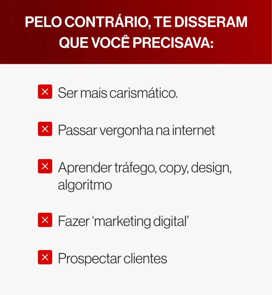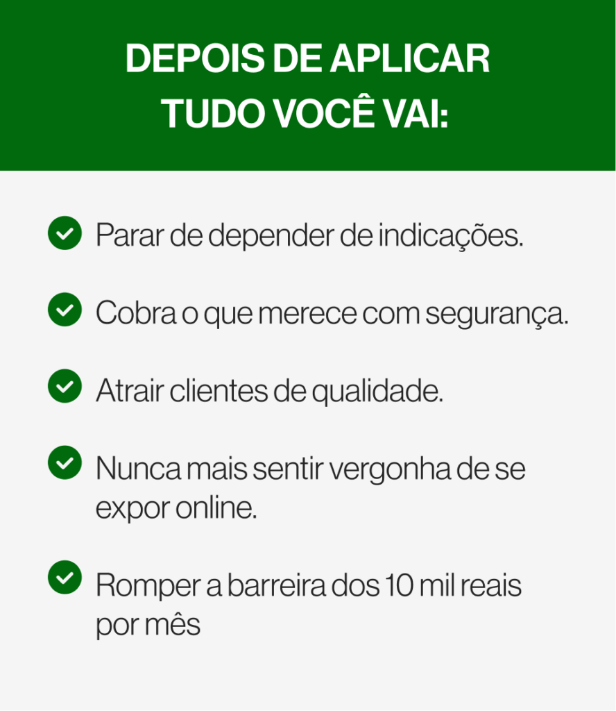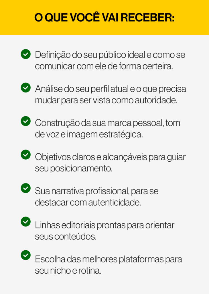 Eu vou criar a sua estratégia de posicionamento eficaz que te fará atrair clientes sem passar vergonha na internet, prospectar pessoas, precisar de muitos seguidores ou investir em tráfego pago.